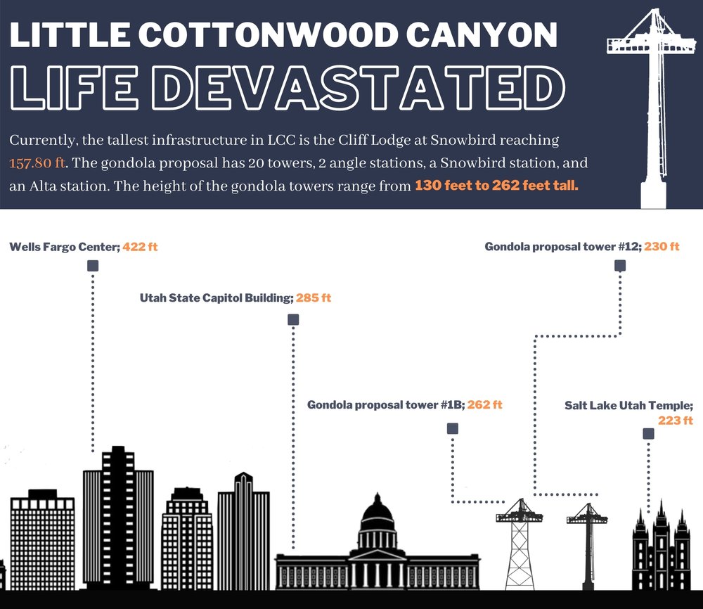 There will be 22 towers averaging 184 feet and reaching up to 262 feet. For comparison, electrical transmission towers are 120 feet tall, which is shorter than the shortest gondola tower. There will be 2 angle stations and loading stations at the base of Little Cottonwood, Snowbird, and Alta.