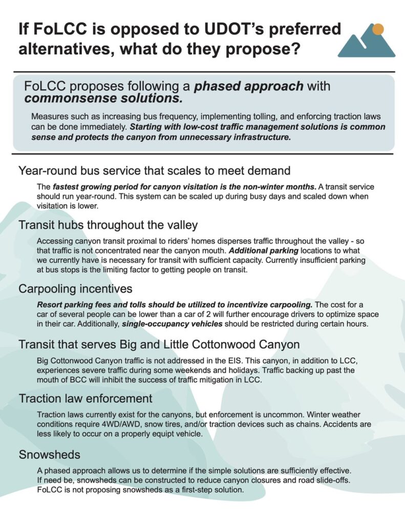 Friends of Little Cottonwood Canyon advocate for commonsense solutions. These include increasing the number of buses, incentives for taking transit and carpooling, and transit that serves both of the cottonwood canyons.