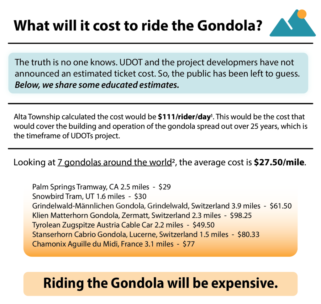 Ticket costs have not been provided to the public. Alta’s Mayor Sondak has estimated a ticket to cost $111/person/day. And, we have looked at various gondolas around the world to see that others are charging.