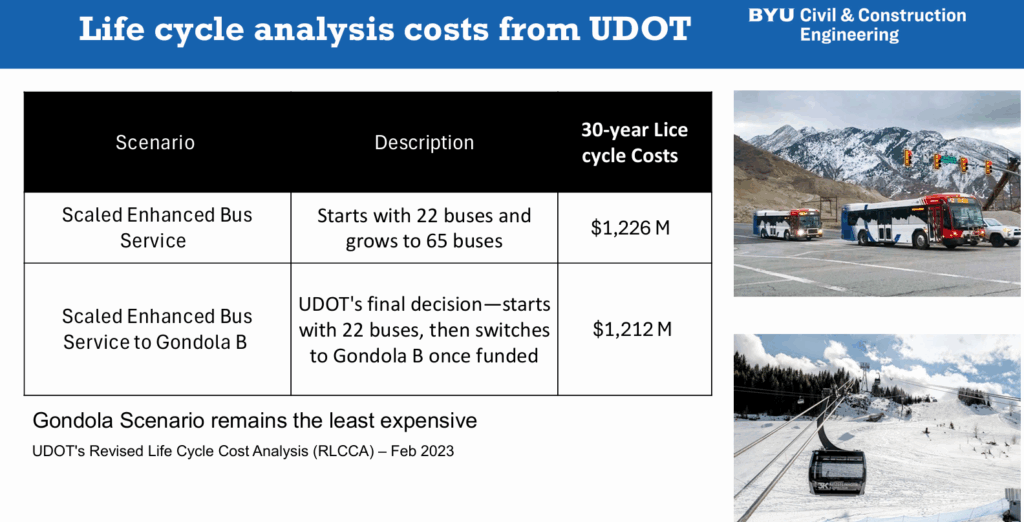 A new Life Cycle Cost Analysis (LCCA) conducted by engineering researchers at Brigham Young University examined UDOT’s calculations, assumptions, and methodology for ascertaining the costs and risks associated with various transportation solutions in Little Cottonwood Canyon. Using best practices for LCCA, the study compared all major transit proposals—including expanded bus service, rail, and gondola options—across several economic scenarios. Its conclusions raise important questions about long-term financial impacts of a gondola and the financial reality and validity of UDOT’s LCCA.