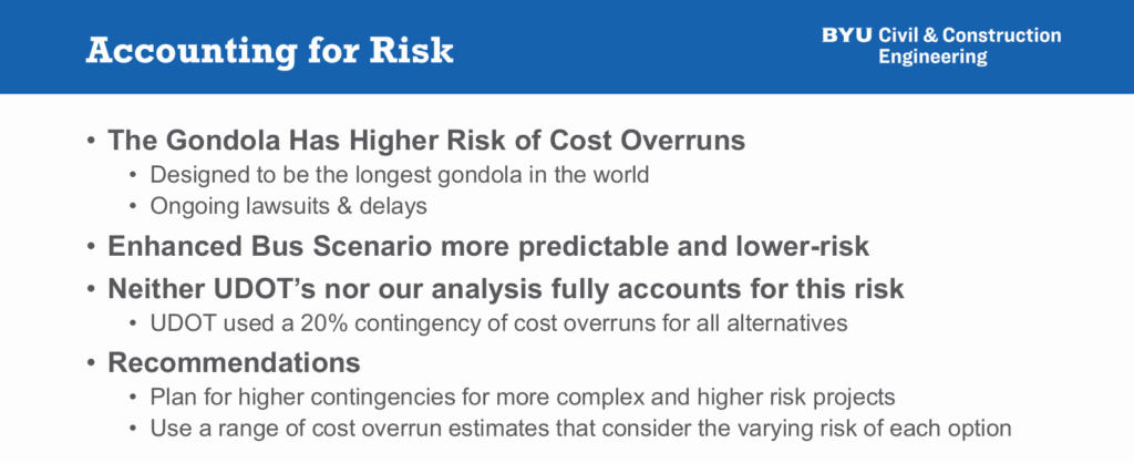 This LCCA study doesn’t necessarily argue for or against the gondola. Instead, it sheds insights into the need for greater scrutiny and transparency in how such major public investments of taxpayer funds are evaluated. However, based on the many issues the BYU analysis raised, we cannot help but question why UDOT did not follow best practices for LCCA in its analysis of LCC transportation alternatives, particularly with respect to the discount rate used, the shorter timeline used, the lack of key assumption risk assessment and scenario analysis.